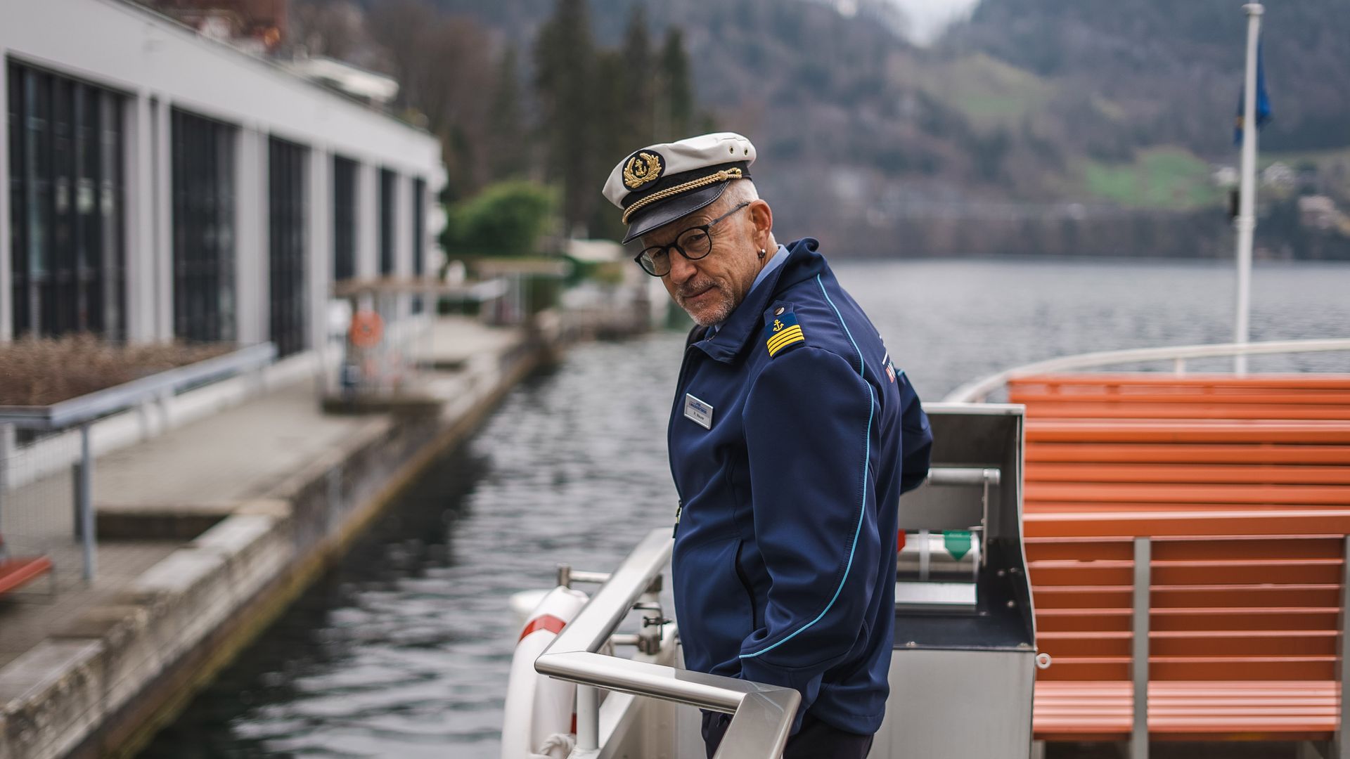 Roger Maurer übergibt das Steuer seinem jüngeren Kollegen. Mit einem Hornen kündigt dieser die Einfahrt beim nächsten Steg an. "Nächster Halt Vitznau", informiert Roger Maurer über die Lautsprecheranlage. Der Kapitän und seine Mitarbeiterin werfen die Seile über die Pfosten und fixieren das Schiff mit Muskelkraft und geschickter Anwendung des Prinzips der Kraftumlenkung am Steg. Schifffahrt ist auch Knochenarbeit. Die beiden ziehen die schwere Zugangsbrücke aufs Schiff. "Ciao Ueli", verabschiedet Roger Maurer einen Passagier, als dieser über die Zugangsbrücke läuft.